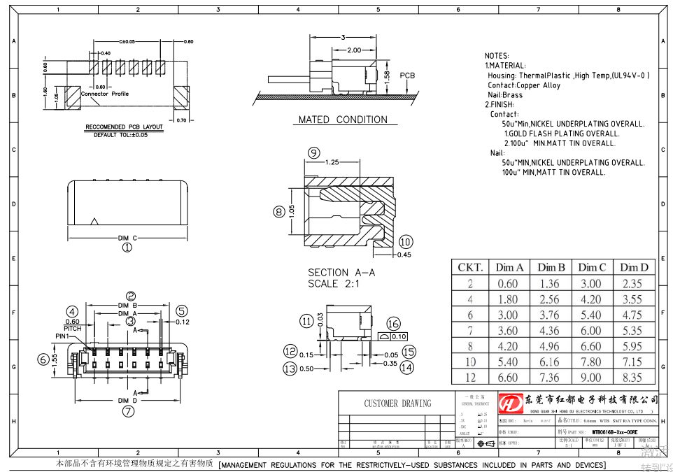 间距(Pitch):0.6mm 极数(Poles):2-12 额定电压(Voltage ratiing):30V AC/DC 额定电流(Current ratiing):0.3A AC/DC 工作温度(Working temperature):-25°~+85°C 绝缘电阻(Insulation resistance):≧500M 接触电阻(Contact resistance):≦30MΩ