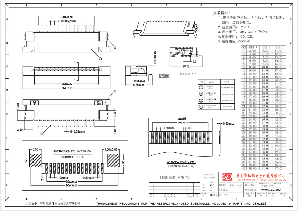 间距(Pitch):1.0mm 极数(Poles):4-40 额定电压(Voltage ratiing):50V AC/DC 额定电流(Current ratiing):0.3A AC/DC 工作温度(Working temperature):-25°~+85°C 绝缘电阻(Insulation resistance):≧500M 接触电阻(Contact resistance):≦30MΩ